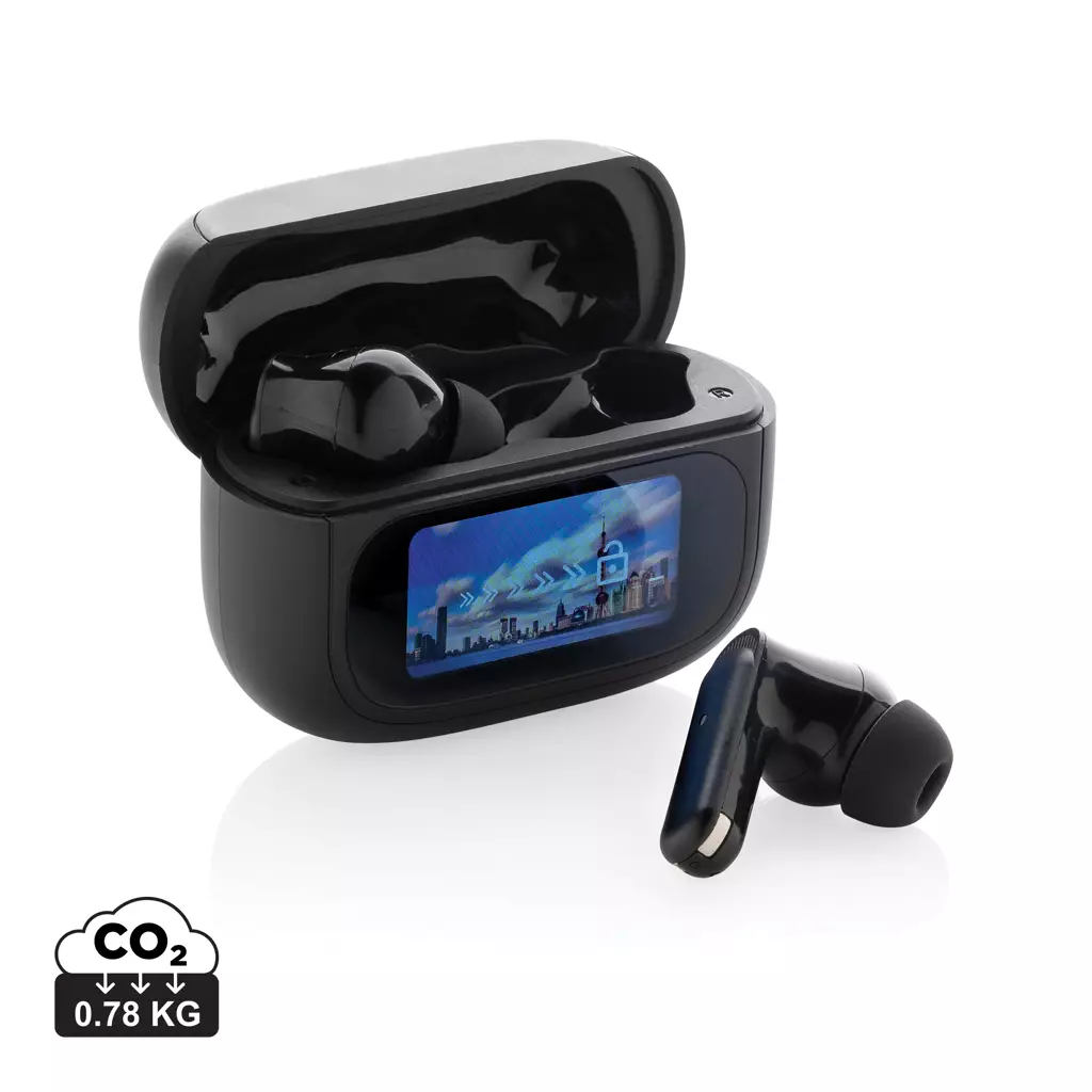 Näillä ANC-kuulokkeilla voit tehdä työmatkoja, työskennellä tai matkustaa äänettömästi. ANC-toiminto varmistaa, että ulkoinen melu vähenee, jotta keskittyminen olisi optimaalista. Latauskotelossa on integroitu TFT-kosketusnäyttö, joka tarjoaa monia ainutlaatuisia toimintoja: korvanappien etsiminen, äänenvoimakkuuden säätäminen, seuraavan kappaleen valitseminen, puheluihin vastaaminen ja kielen vaihtaminen (voit valita 8 kielen välillä) ja paljon muuta. Kuulokkeet ja latauskotelo on valmistet kierrätetystä ABS muovista. Kuulokkeissa on 30 mAh:n akku, joka mahdollistaa jopa 6 tunnin soittoajan. Voidaan ladata uudelleen 1,5 tunnissa latauskotelossa. Mukana 3 koon korvanapit. Merkkaus tampopainatuksella.