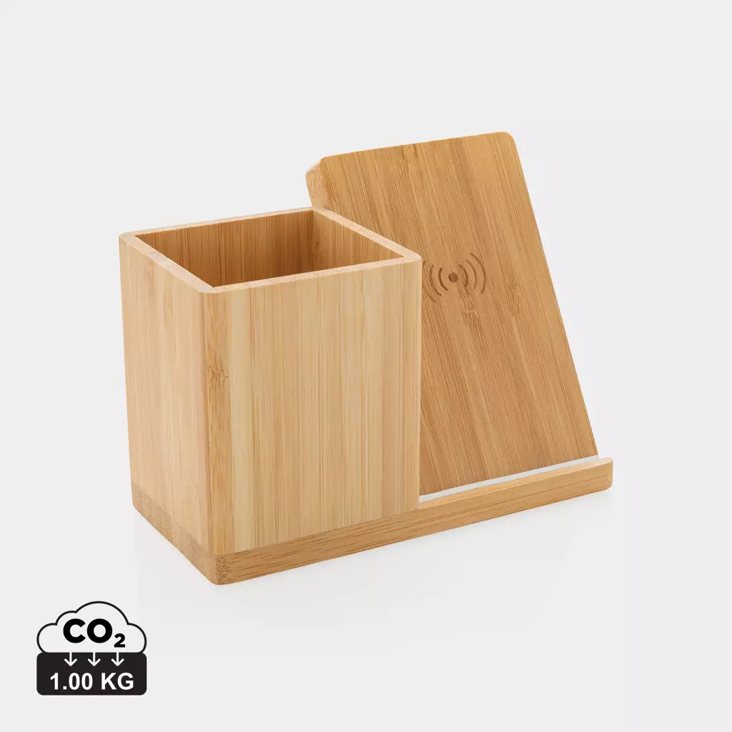 10W pikalaturi kynäpidikkeellä valmistettuna RCS (Recycled Claim Standard) sertifioidusta kierrätetystä ABS:stä. Kierrätetyn materiaalin kokonaismäärä: 6% perustuen tuotteen painoon (sisältäen bambupohjan). Bambuinen ulkokuori valmistettu FSC 100 bambusta. Sisältää 120 cm tyypin C latauskaapelin, joka on valmistettu RCS-sertifioidusta kierrätetystä TPE:stä. Pakattu FSC-sekoituksesta valmistettuun kraft pakkaukseen. Tyyppi C tulovirta: 5V/2A; 9V/1.67A. Langaton lähtövirta: 5V/1A/1.1A (10W) Rekisteröity design®