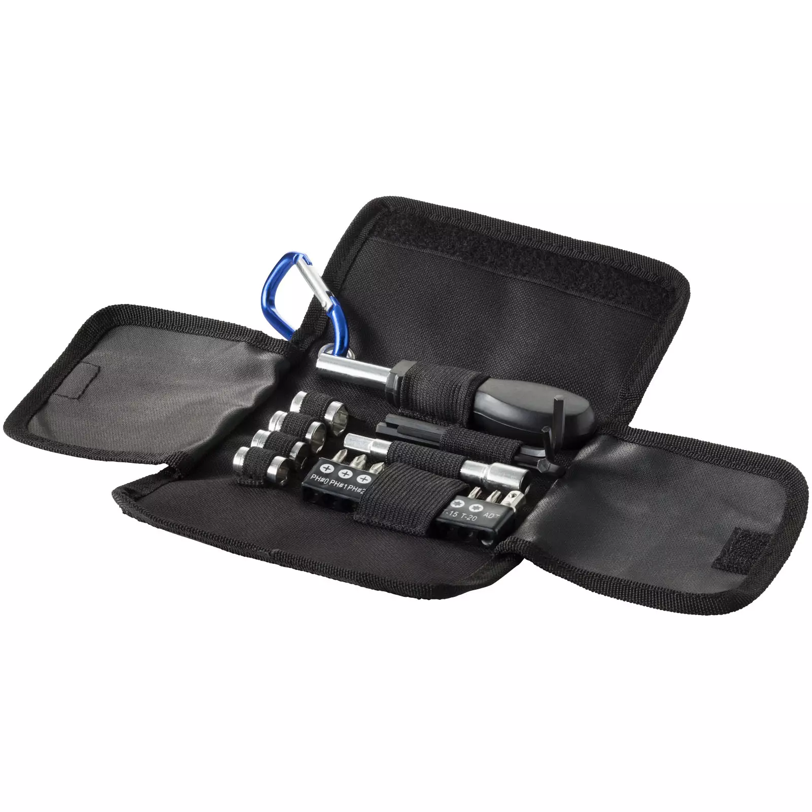 Pieni ja taitettava 19 osan työkalusetti, jossa on kiinnityskoukku säilytykseen. Setin sisältö: 4 x hylsyjä (7-8-9-10 mm), 1 x ruuvimeisseli, 10 x ruuvimeisselin metallipäätä, 1 x jatko-osa ja 3 x kuusiokolosettejä (3-4-5 mm).