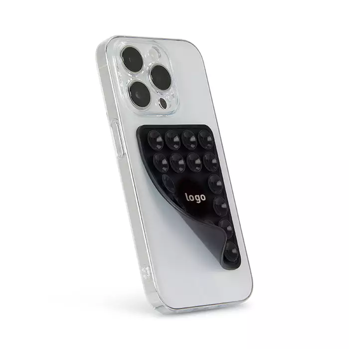 Tuote kiinnittyy puhelimen takakanteen vahvalla tarralla ja siinä olevien 20 imukupin avulla kiinnitätä kännykän nopeasti ja helposti kuvausta tai selausta varten.