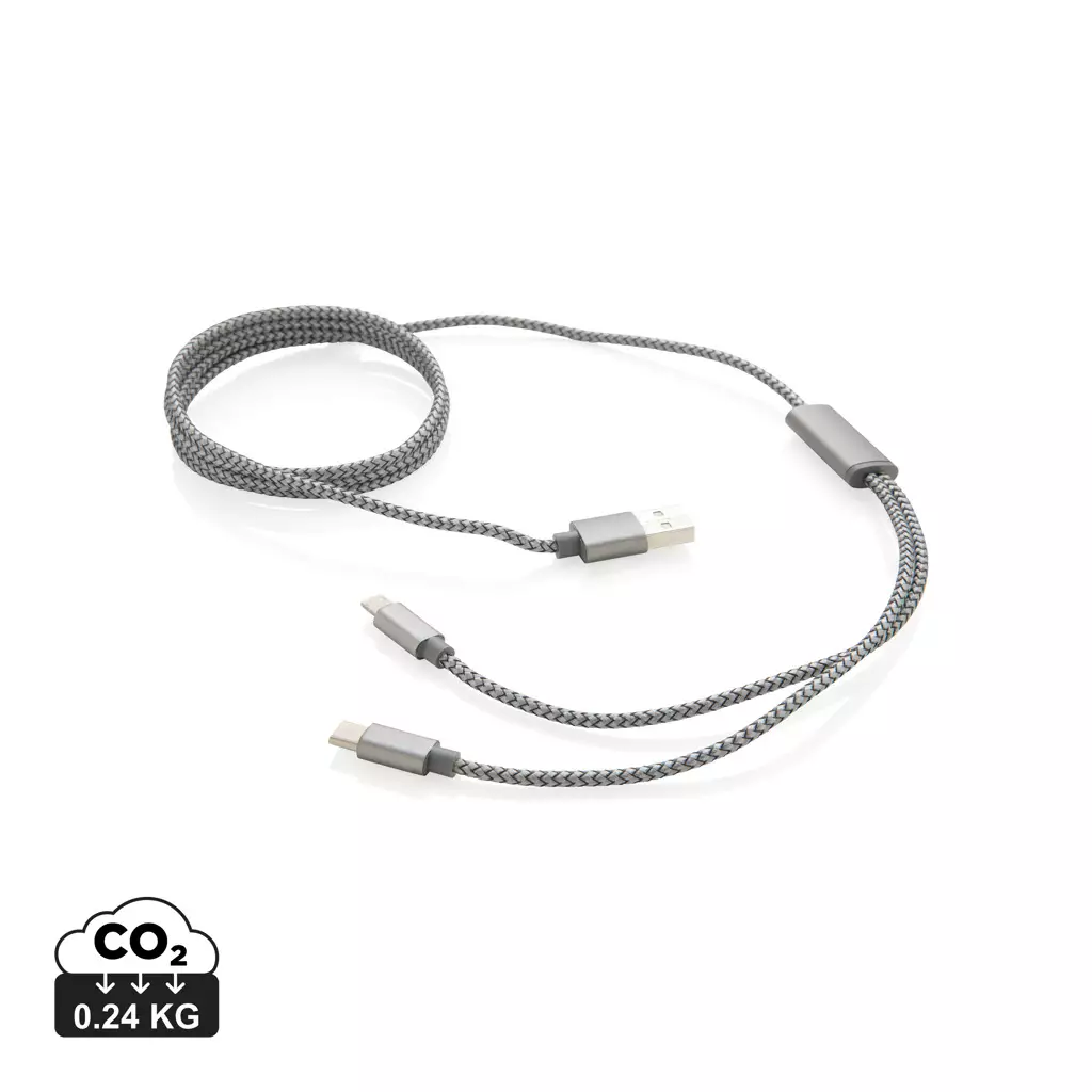 Ylellinen punottu 3-in-1-johto, jossa tyypin C ja kaksipuolinen liitin iOS- ja Android-laitteille, jotka vaativat mikro-USB-liitännän. Punottu nailonjohto, jonka liittimet on valmistettu kestävästä alumiinista. Sopii lataukseen. Pituus 120 cm.