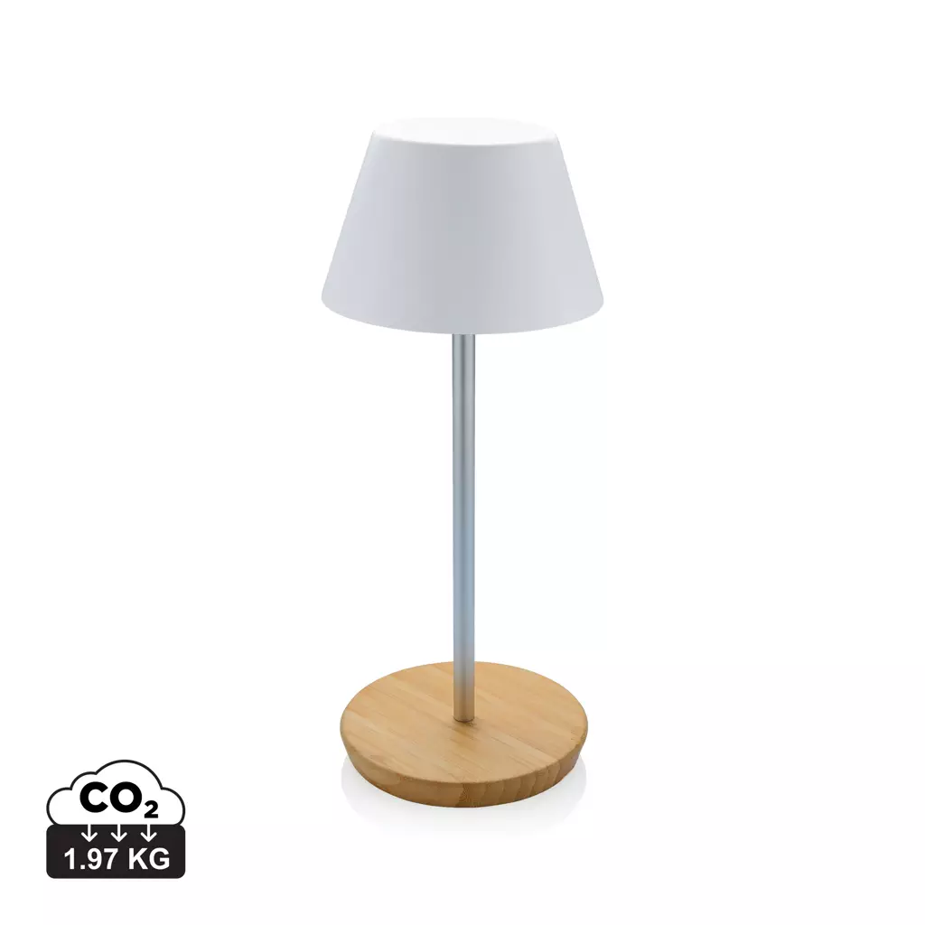Ylellinen pöytävalaisin on valmistettu kierrätetystä ABS-muovista, kierrätetystä alumiinista ja bambusta. Pöytävalaisin toimii yhdellä latauksella jopa 12 tuntia ja sen voi ladata uudelleen 2 tunnissa. Siinä on 1800 mAh:n akku. Kaksi toimintoa:lämmin valo ja valkoinen valo, jotka voidaan säätää kosketusanturin avulla jalustassa. Merkkaus laserkaiverruksella.