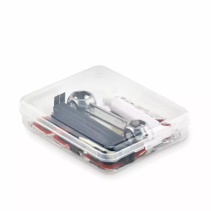 Tämän sarjan avulla kaikki tarvitsemasi välineet kulkee helposti mukana. Työkalut on pakattu läpinäkyvään laatikkoon.