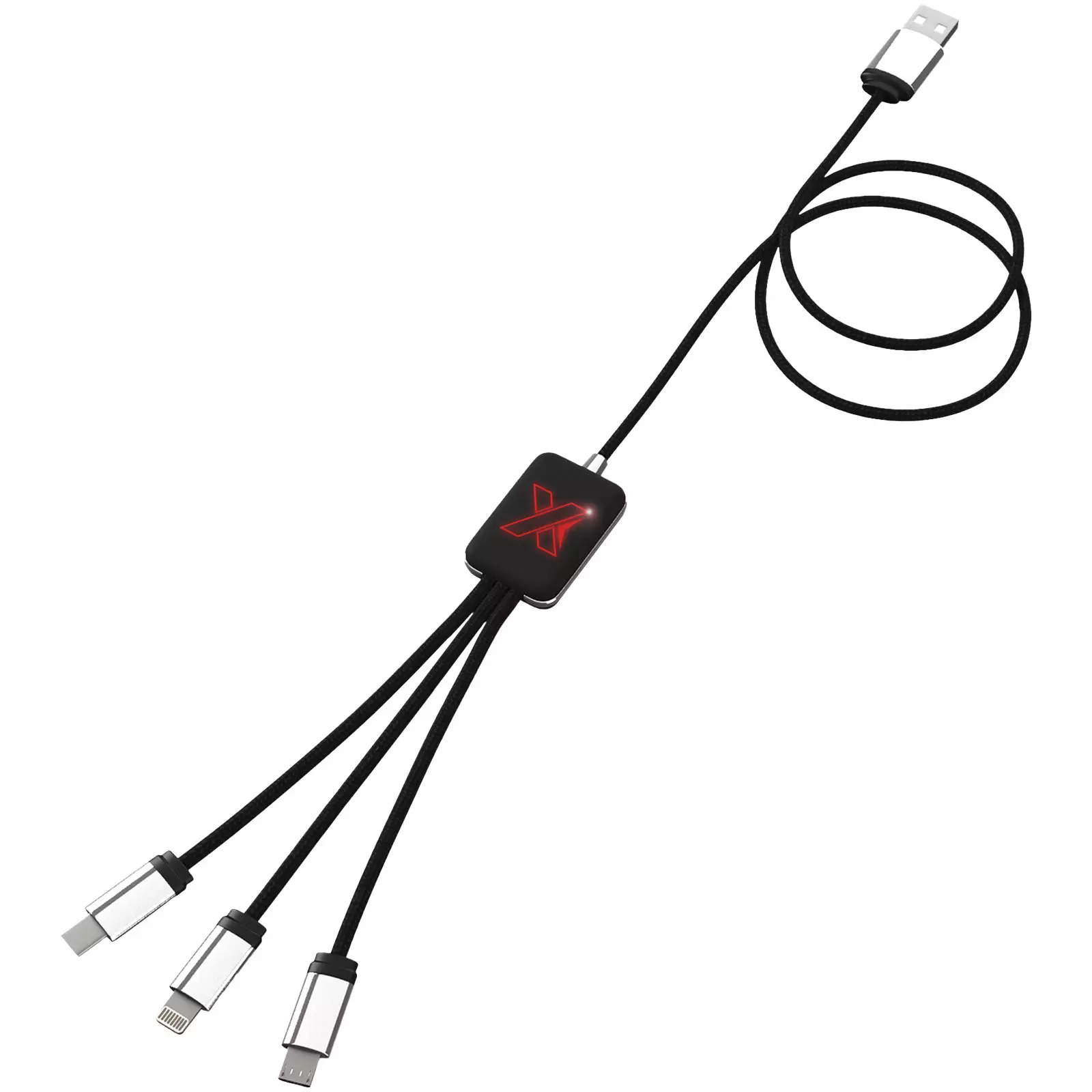 Valaistuvalla logolla varustettu latauskaapeli, kumi ja metalli viimeistely, kolmella liittimellä (Type-C, Android, iPhone). Jopa kolmea laitetta voidaan ladata samanaikaisesti. Kaapelin pituus (mukaan lukien pistokkeet): 10 cm. Kaapelin kokonaispituus: 1 metri. Johtojen materiaali kierrätys RPET muovi, pakkaus on valmistettu kierrätetystä paperista ja kierrätetystä muovista.