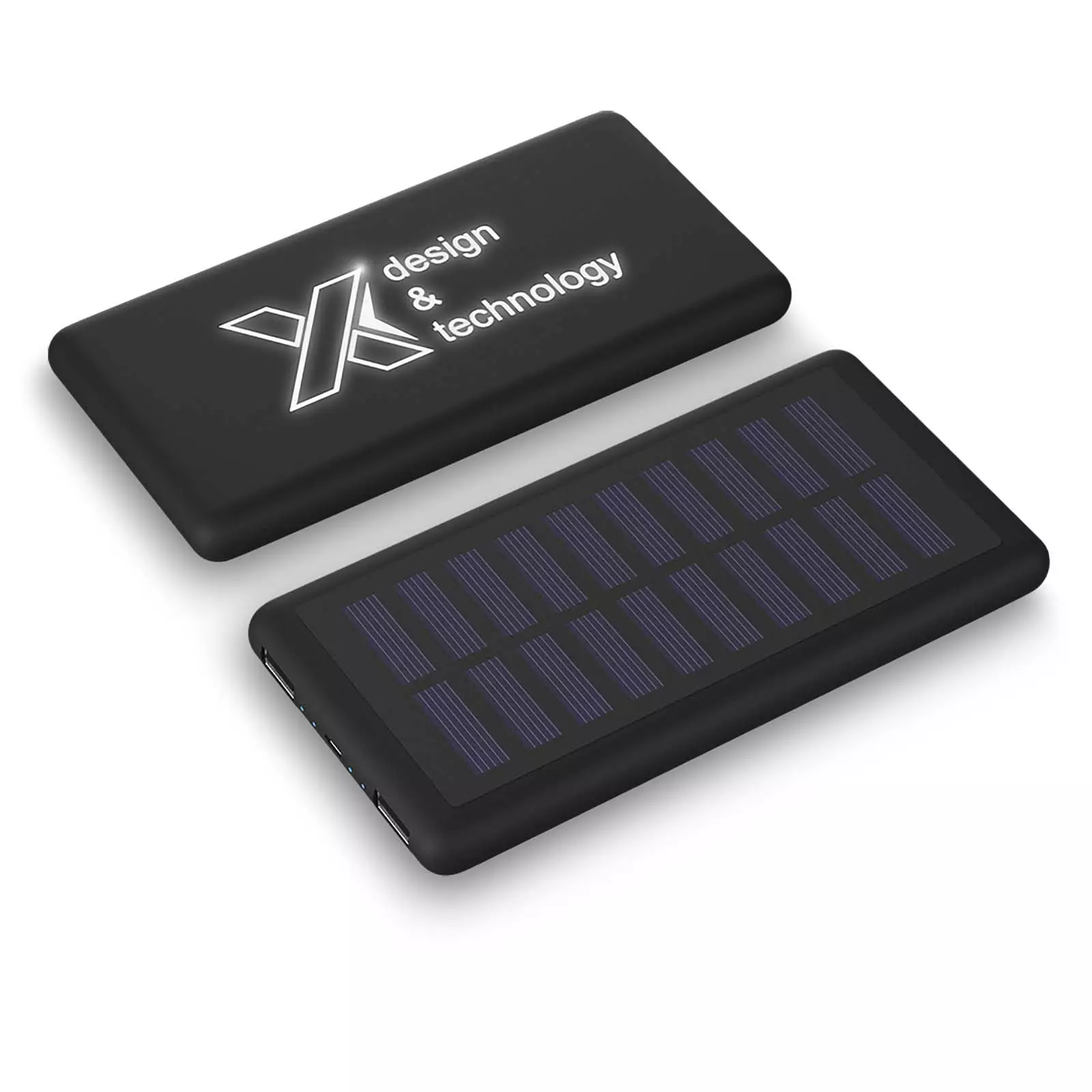 8000 mAh:n valaistuva varavirtalähde aurinkokennoilla ja 3-in-1-kaapelilla (Type-C, Android, iPhone). Kaapelin materiaali kierrätetty RPET-muovi, aurinkokennon materiaali monocrystalliini. Laite valaistuu 30 sekunnin ajaksi kosketuksesta tai kun sitä ladataan. Kapasiteetti: 8000 mAh. Tulo: 5 V / 1 A USB. Lähtö: 5 V / 2 A. Latausaika auringossa/keinovalossa: 240 mAh/h (täysi lataus noin 27 tuntia). Varavirtalähteen voi ladata myös mukana toimitetulla kaapelilla. Koko: 153 × 76 × 13,5 mm. Toimitetaan lahjarasiassa, joka on valmistettu kierrätyspaperista.