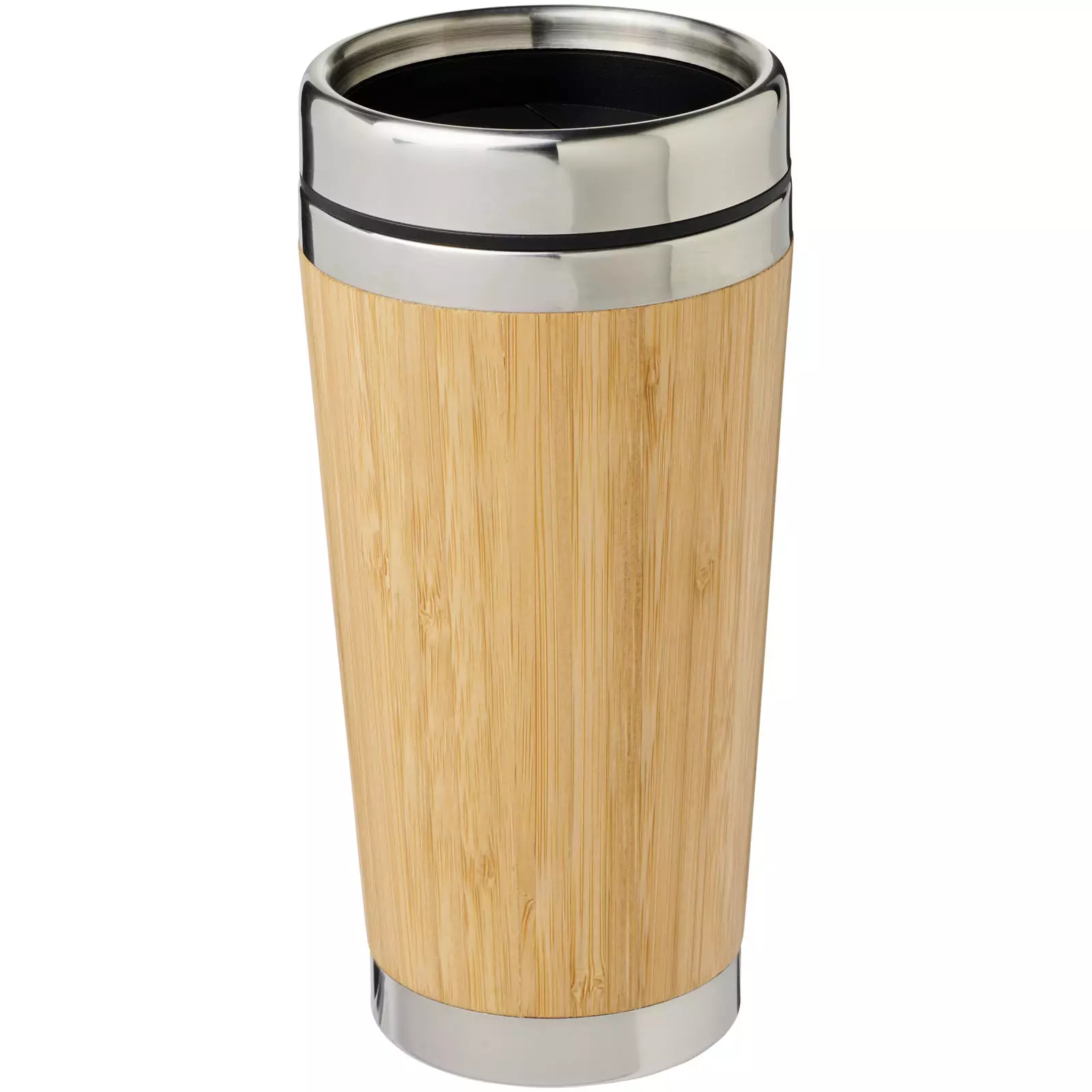 Kaksinkertainen ja eristetty juomamuki on valmistettu ruostumattomasta teräksestä ja sen ulkopuoli on luonnonbambua. Se pitää juomat kuumana 2 tuntia ja kylmänä 4 tuntia. Siitä juominen on helppoa liu’uttamalla suljettavan kannen läpi. Merkkaustapa: laserkaiverus
