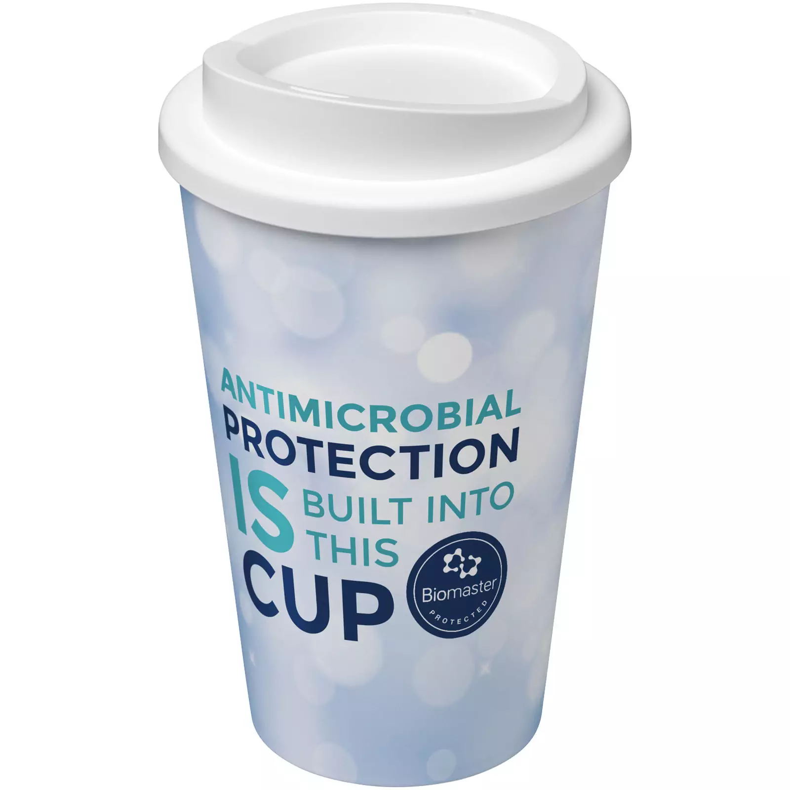 Kaksiseinäinen eristetty muki, jossa on kierrettävä kansi. Mukia ympäröi värillinen, materiaaliin upotettu kuvio, joten se on pitkäikäinen ja kestävä. Antimikrobinen Biomaster-tekniikka kannessa ja mukin sisällä suojaa haitallisten mikro-organismien kasvulta. Tämä toimii tehokkaasti tuotteen koko käyttöiän ajan eikä vaikuta kierrätettävyyteen. Kestää konepesun ja lämmityksen mikroaaltouunissa. Mukin tilavuus on 350 ml. Valmistettu Isossa-Britanniassa. Pakattu kompostoituvaan pussiin. BPA-vapaa.