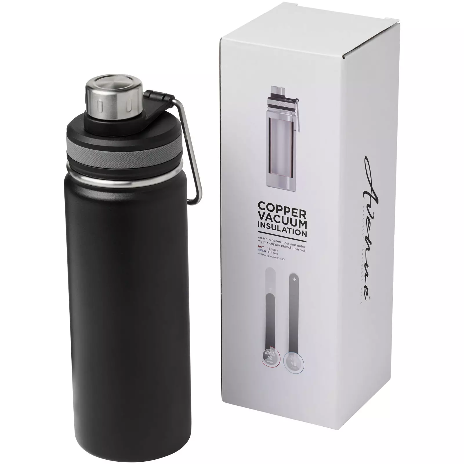 Kestävä, kuparieristetty kaksinkertainen tyhjiörakenne, joka pitää juomasi kuumana 12 tunnin ajan ja kylmänä 48 tuntia. Rakenne estää myös kondensoitumisen pullon sisällä. Ruostumattomassa teräskierrekannessa on kätevä kantokahva. Kaksi suuaukkoa helpottavat pesua ja täyttöä. Pullon tilavuus on 590 ml. Toimitetaan Avenue-lahjapakkauksessa.