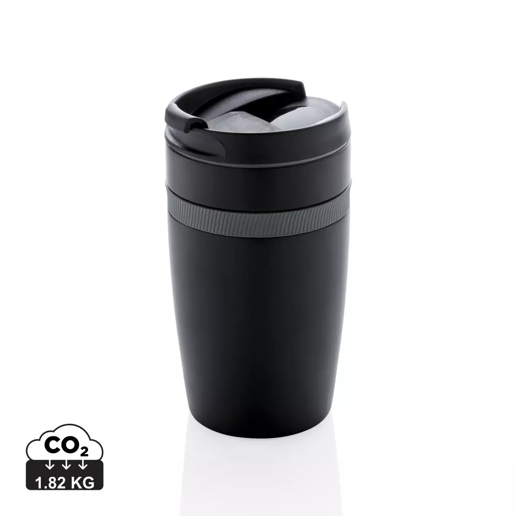 Juuri oikean kokoinen. Sopii täydellisesti useimpiin kahvinkeittimiin. Tämä tyhjiöeristetty kaksoisseinäinen ruostumattomasta teräksestä valmistettu kahvimuki, jossa on silikonikaista. Pitää juomasi kuumana jopa 5 tuntia ja kylmänä jopa 15 tuntia. Sisältö: 280 ml. Rekisteröity design®