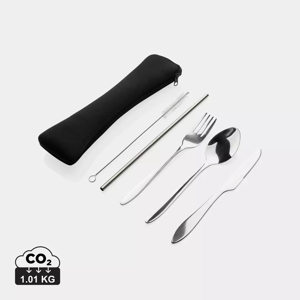 Uudelleenkäytettävä aterinsetti ruostumattomasta teräksestä. Se on helppo ottaa mukaan minne vain. Tämä setti sisältää haarukan, veitsen, lusikan, pillin ja harjan, pillin puhdistamista varten. Kaikki tarvikkeet mahtuvat neopreenikoteloon.