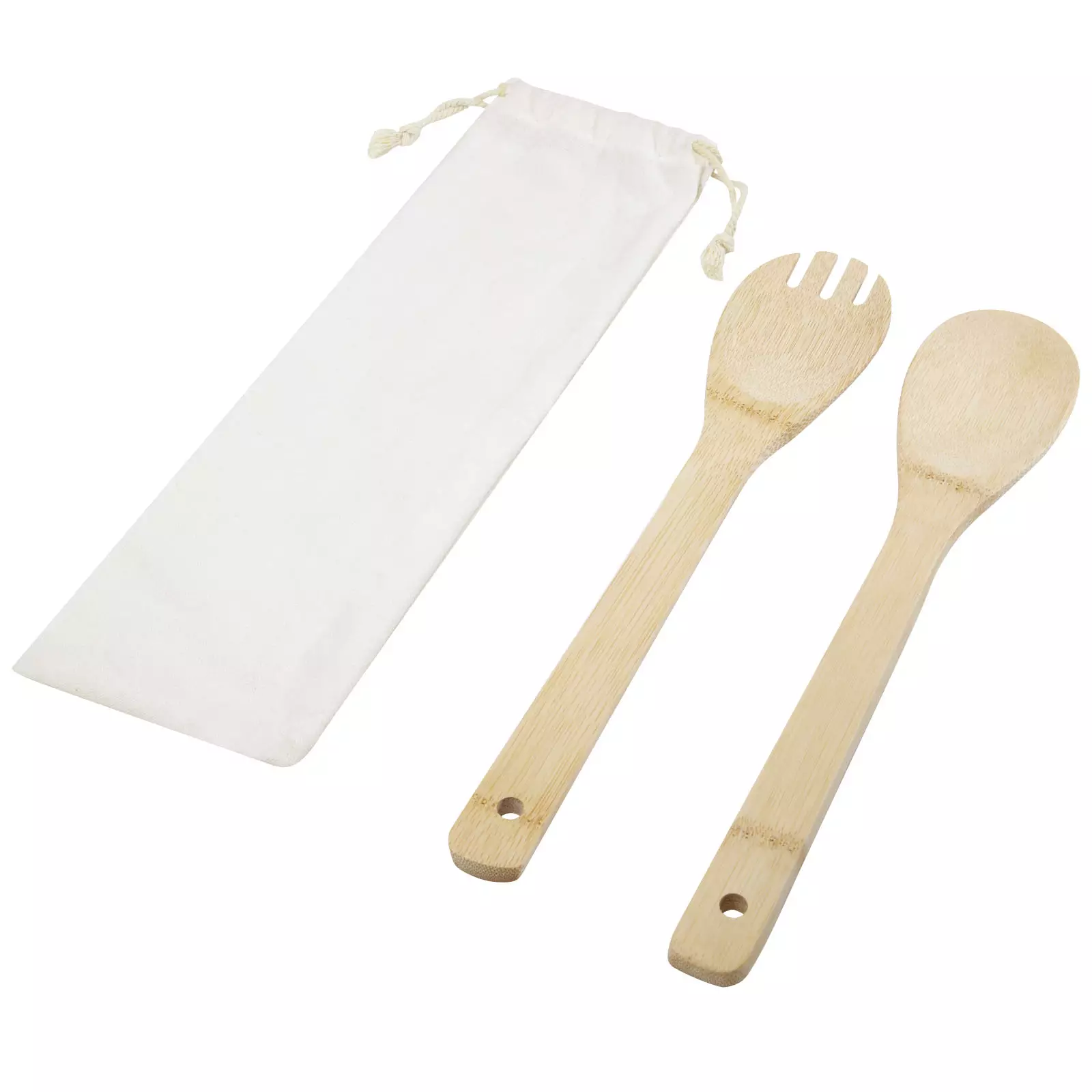 Bambusta valmistettujen salaattilusikan ja -haarukan yhdistelmä, käytännöllinen jokaiselle perheillalliselle. Bambu on hankittu ja valmistettu kestävän kehityksen standardien mukaisesti.