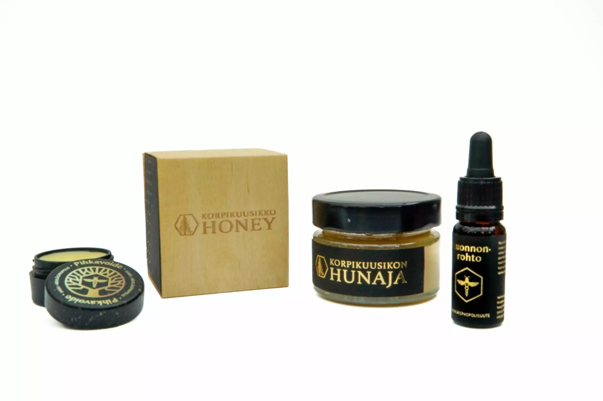 Hunaja, pihkavoide, luonnonrohto & lahjakassi valmistettu Suomessa.