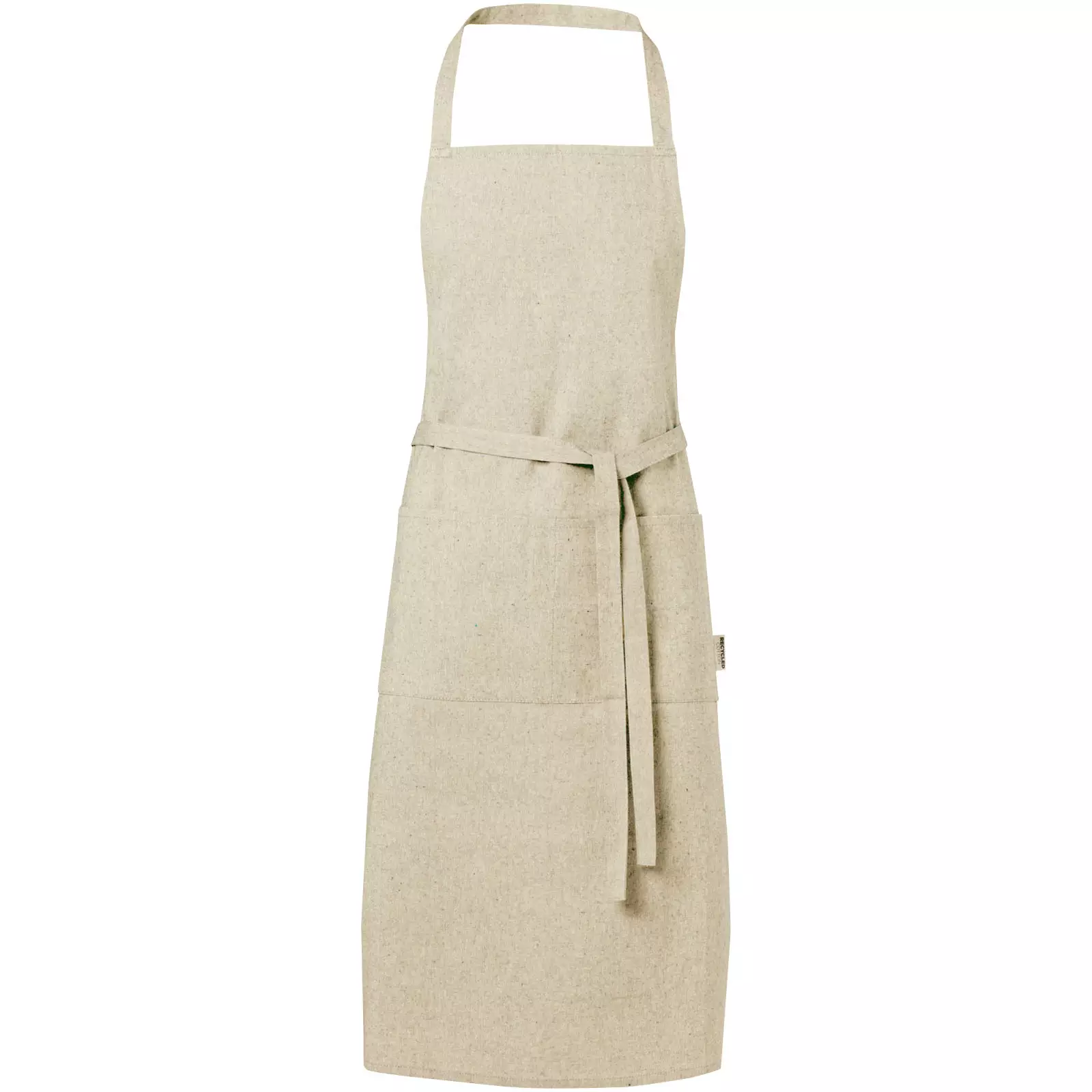 200 g/m² kierrätetystä puuvilla-polyesteriseoksesta valmistettu esiliina. Kaksi vierekkäistä taskua, joiden yhteiskoko on 45 x 20 cm ja metrin pituiset sidontanauhat. Kierrätetty puuvilla tuotetaan valmistusmateriaalin ylijäämästä, jota syntyy tekstiilitehtaissa leikkaamisen aikana. Kierrätetyn puuvillan ominaisuuksista johtuen väri saattaa vaihdella hieman. Niskahihnan pituus: 55 cm.