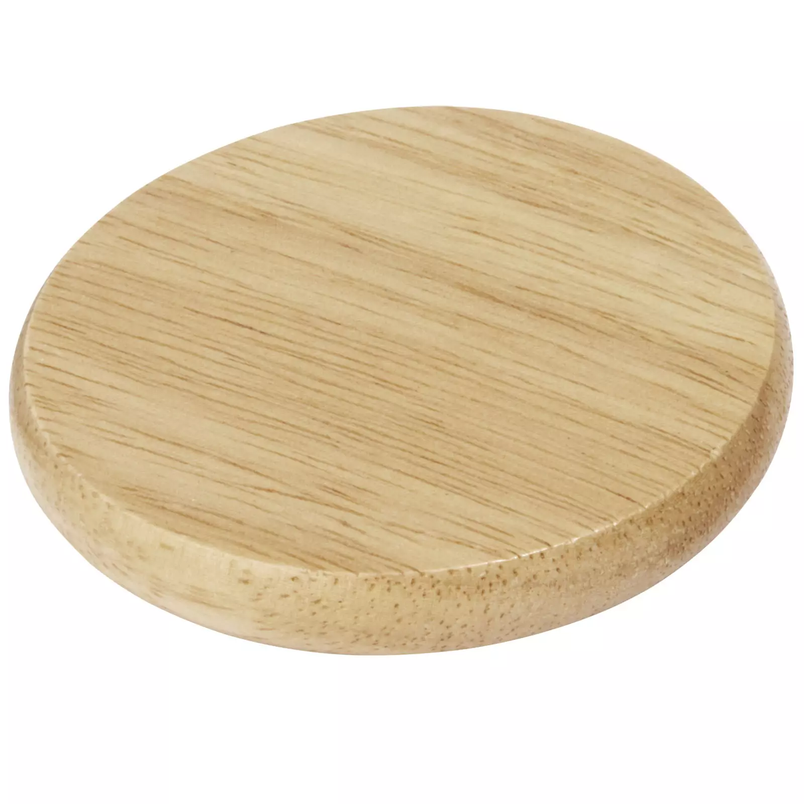 Puinen lasinalunen ja ruostumattomasta teräksestä valmistettu pullonavaaja.