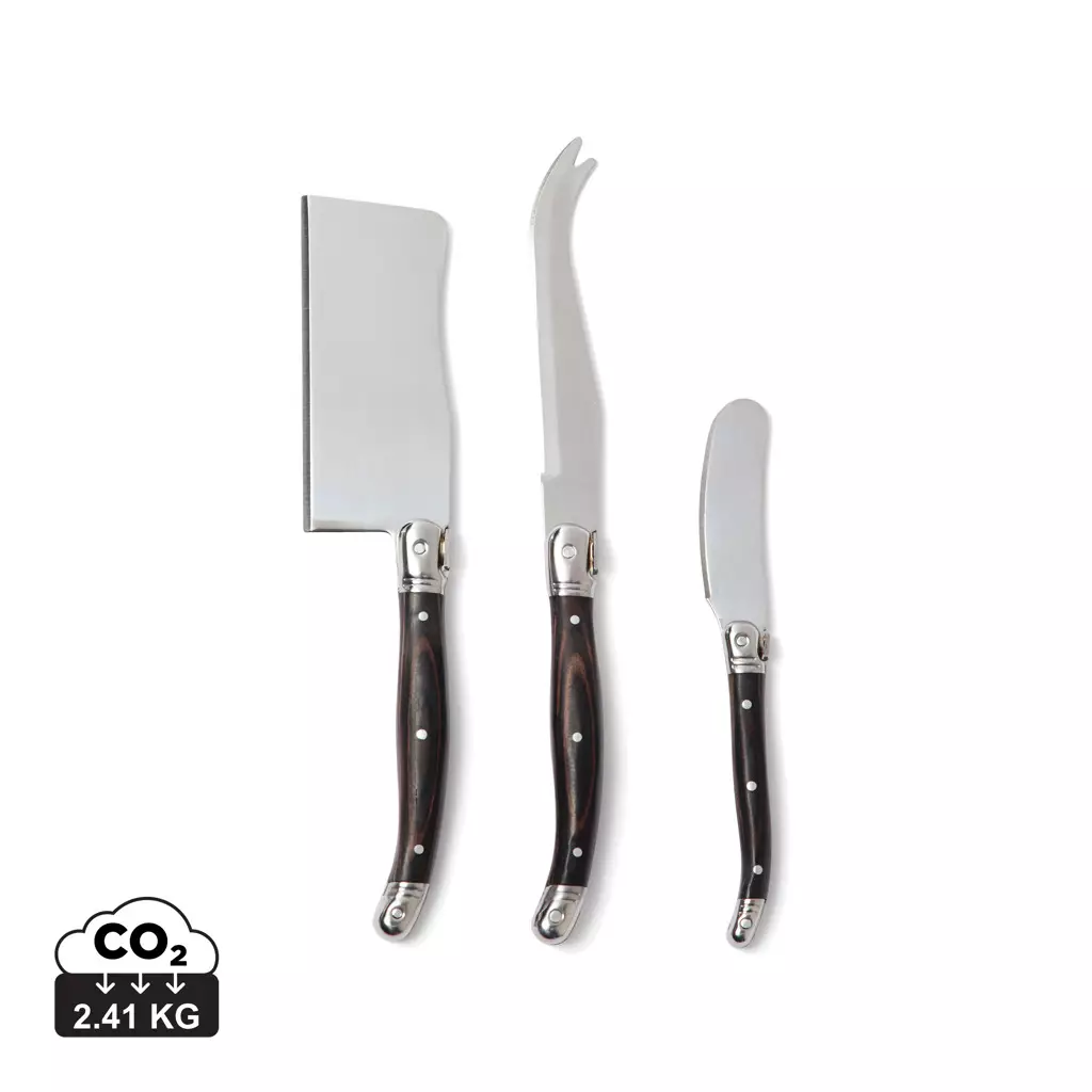Ylellinen tarjoilusetti, jossa voiveitsi ja kaksi käytännöllistä ja tyylikästä veistä erilaisille juustoille ja muille herkuille. Terät ovat ruostumatonta terästä ja kahvat Pakkawoodia. Konepestävä.