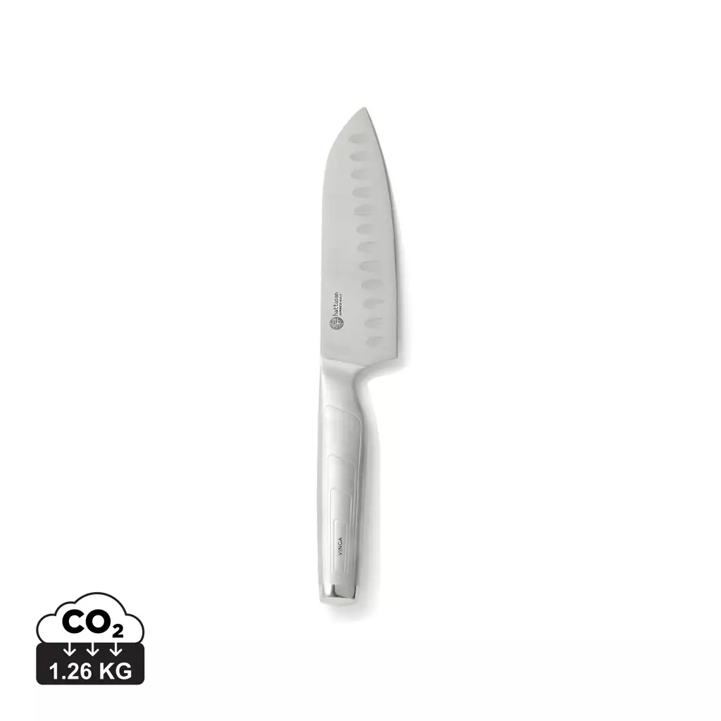 Erittäin laadukas veitsi japanilaista terästä (420 J2). Santoku on japanilainen veitsi, joka monipuolisuutensa vuoksi muistuttaa perinteistä kokkiveistä. Santokuveitsi eroaa perinteisestä kokkiveitsestä lyhyemmällä terällään, joka tekee leikkaamisesta nopeampaa samalla. Terän viilteet estävät leikatun pinnan voimakkaan tarttumisen terään. Keittiössä olisi hyvä olla santoku- sekä kokkiveitsi. Santokua käyttäisit varmaankin useammin, mutta tarvitset myös joihin pilkkomistöihin pidempiteräistä kokkiveistä.