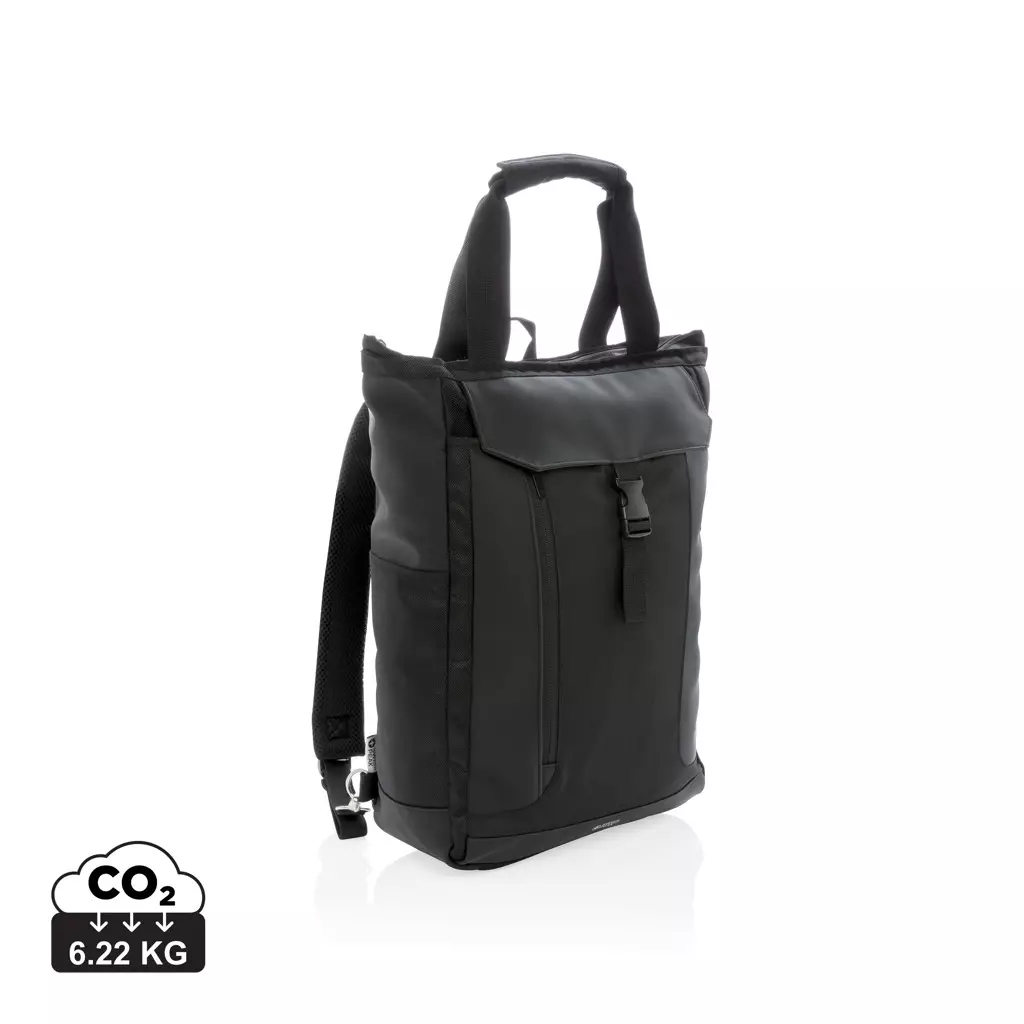 Tätä monipuolista laukkua voidaan kantaa olalla, kädessä tai reppuna. Sisältää pehmustetun lokeron 15 tuuman latopille ja RFID-suojatut kotelot. Ei sisällä PVC:tä.