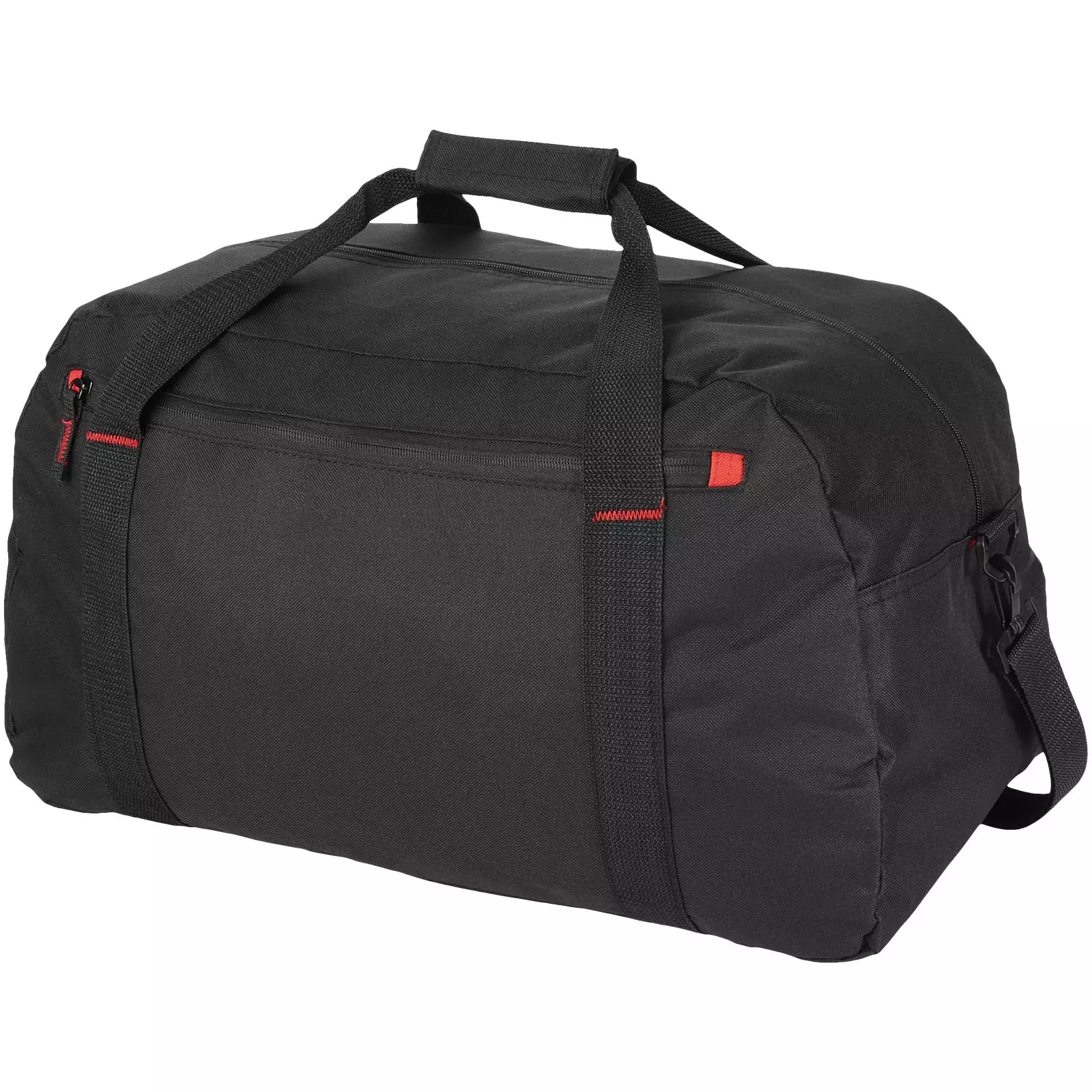 Laukussa on punainen yksityiskohta, vetoketjullinen etutasku ja säädettävä olkahihna.