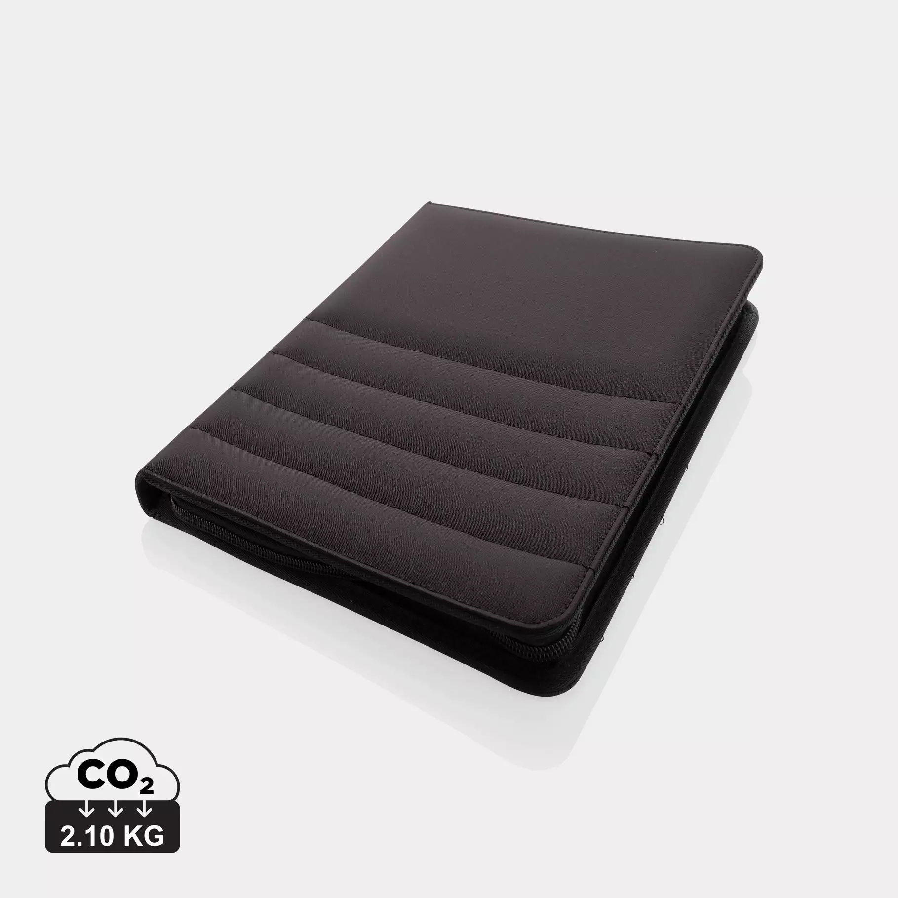 Pidä kokoustarvikkeet järjestyksessä tällä kauniilla vetoketjulla varustetulla kokouskansiolla. Kansion sisällä on kokousmuistio, tasku puhelimelle, 2 lisätaskua, 4 korttipaikkaa ja kynäsilmukka. Muistilehtiössä on 20 arkkia kermanväristä vuorattua 80 gm/s kierrätyspaperia. Sisä- ja ulkopinta 100% kierrätettyä polyesteria AWARE™-merkinnällä. PVC-vapaa. Mikäli valitset tämän tuotteen, säästät 6 litraa vettä ja 10 muovipulloa uudelleenkäytetään. Merkkaustapa: silkkipainatus tai siirtokuva