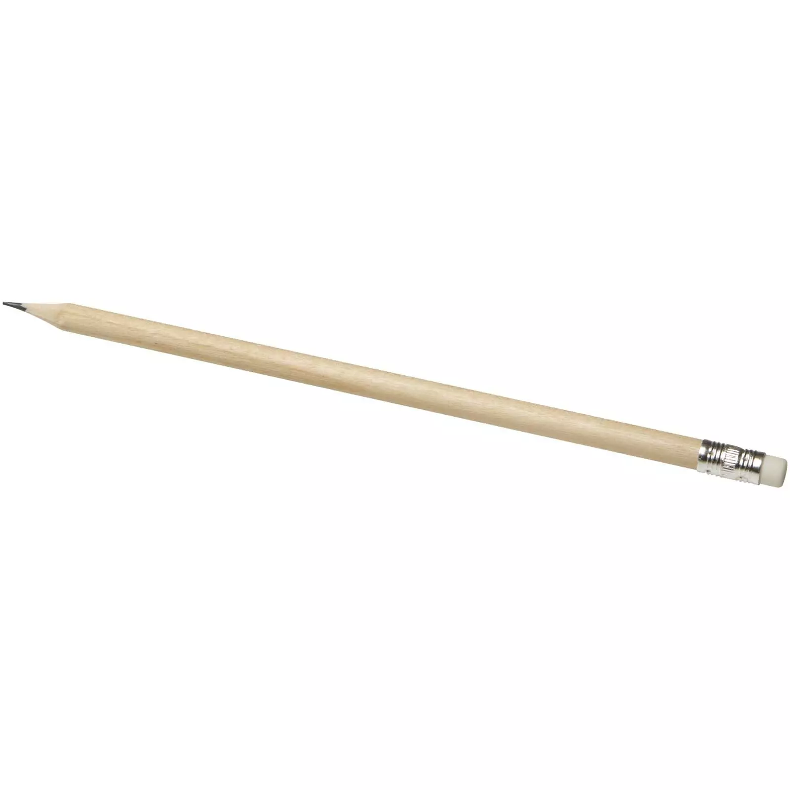 Lyijykynä pyyhekumilla. Lyijykynä on poppelipuuta, pyyhekumi grafiittia ja holkki alumiinia.