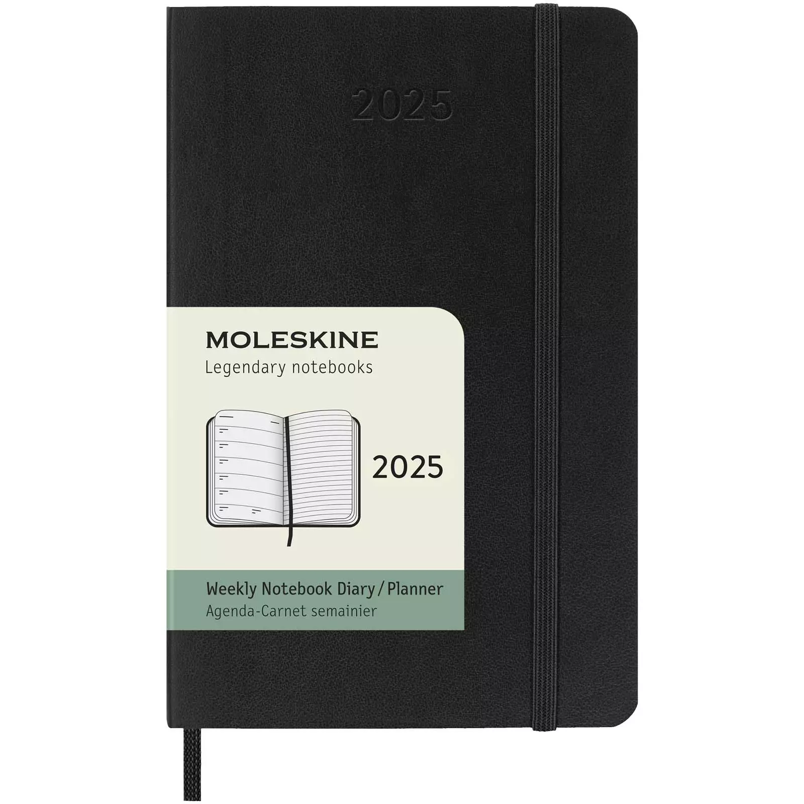 Pehmeäkantisessa Moleskine 12 kuukauden viikkopäivyrissä tammikuusta joulukuuhun 2025 näkyy koko viikko yhdellä silmäyksellä. Lisäksi siinä on vuosi- ja kuukausikatsaussivuja laajemman kokonaiskuvan saamiseksi vuodesta sekä sivuja matkasuunnitelmia, ideoita ja tavoitteita varten. Kunkin viikon päivät näkyvät toisella puolella, ja toisella puolella on viivattu sivu tehtäviä ja muistiinpanoja varten. Päivyrissä on norsunluun väristä hapotonta paperia, musta kuminauhasuljin, sivunauhamerkki, väriltään yhtenevä laajennettava sisätasku, tarroja henkilökohtaiseen räätälöintiin sekä vuositarrat selkäosaan.