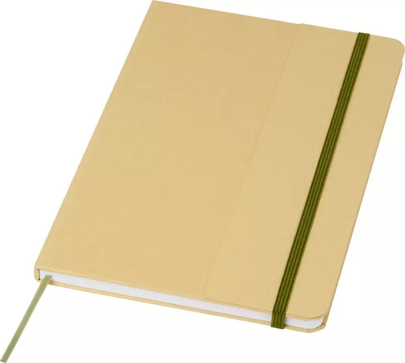 Kierrätetystä kartongista valmistetussa Nelida muistikirjassa on kovat kannet ja värillinen kuminauha suljenta.