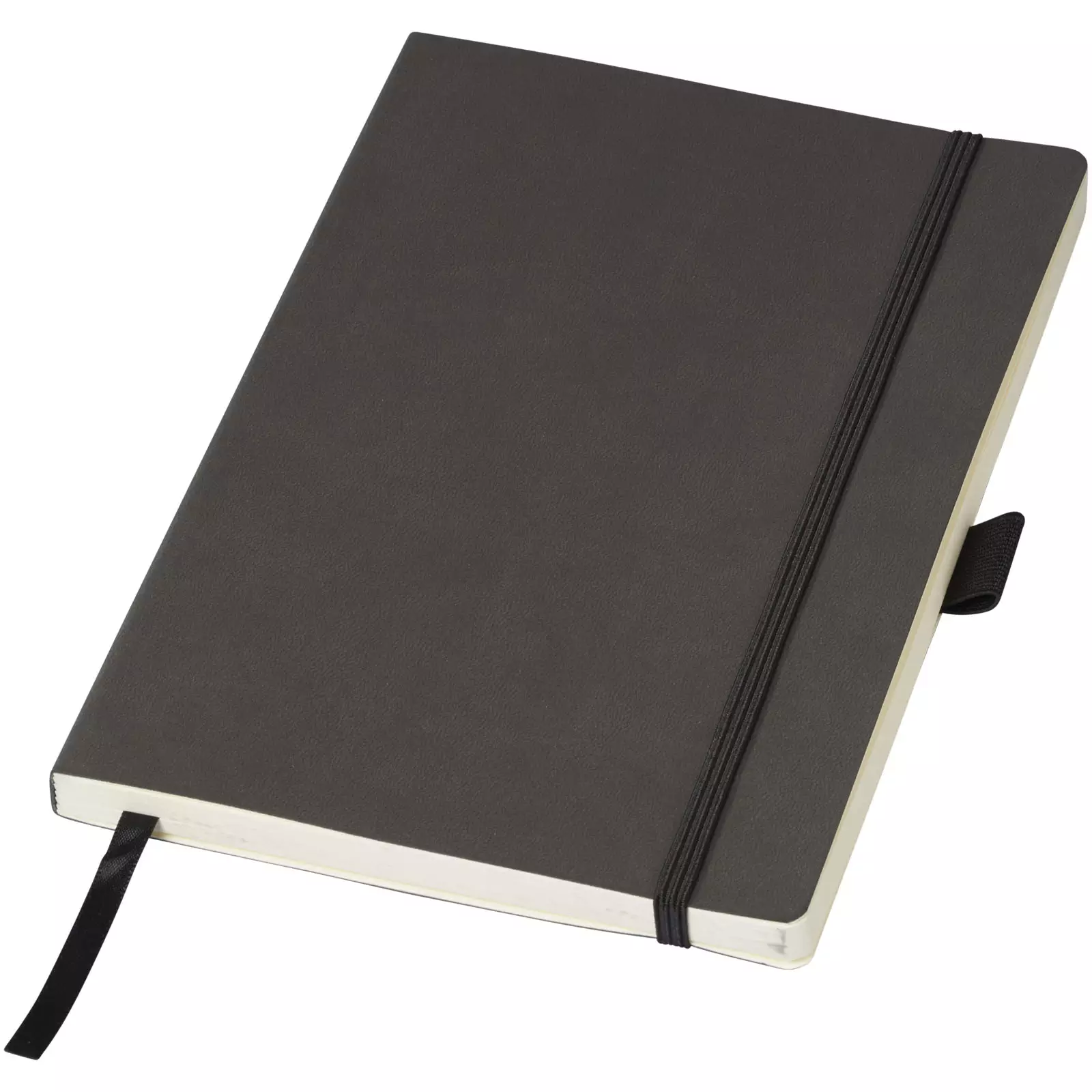 Joustava pehmeäkantinen muistikirja (A5-koko) elastisella sulkimella, nauhamerkillä, kynäsilmukalla ja asiakirjatasku takaosan sisäpuolella ja 80 arkkia (80gsm) kermanväristä viivallista paperia. Pakattu mustaan pussukkaan.