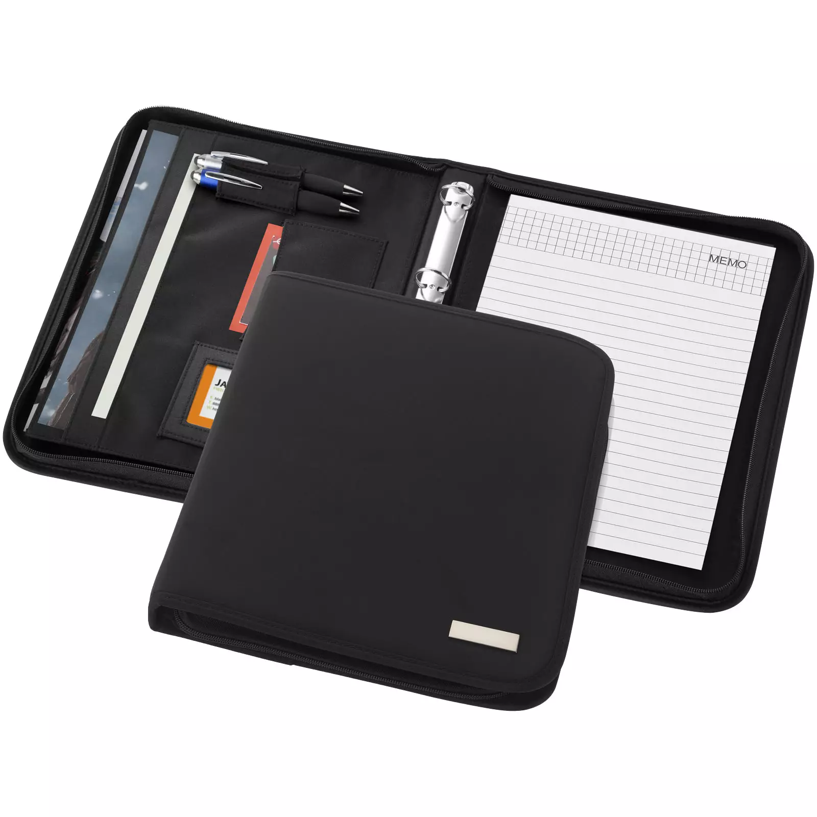 Kansiossa on vetoketju, kynälenkki, asiakirjataskut ja 20 viivoitettua muistipaperia. Kynä ja tarvikkeet rekvisiittaa. Merkkaustapa: lasermarkkaus, linssitarra tai tampopainatus