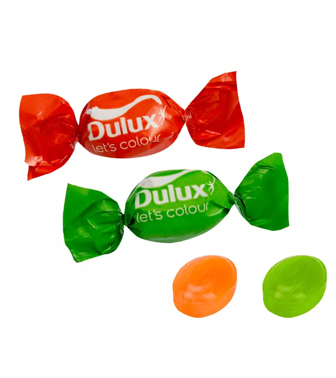Kova mainoskaramelli painatettavassa mainoskääreessä.