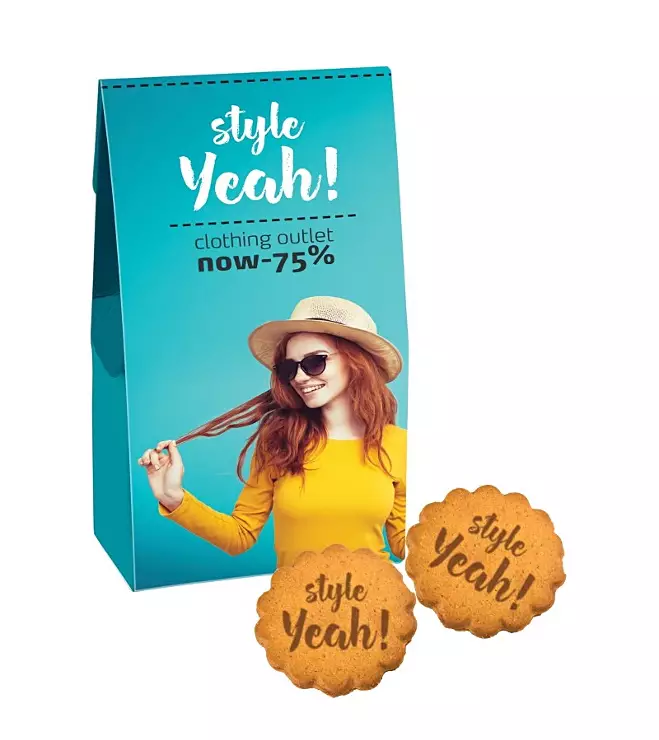 Logomerkattu pahvirasia sisältää seitsemän logomerkattua keksiä.