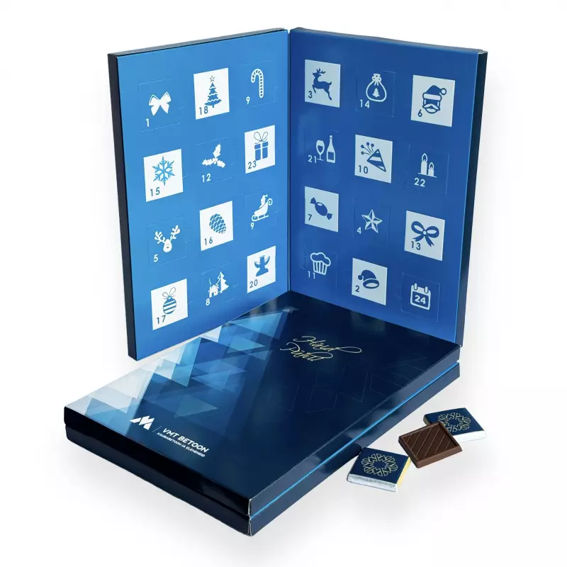 Muista asiakkaita tai henkilökuntaa makealla ja mieleenjäävällä lahjalla. Tämä suklaakaleneri aukeaa kuten kirja ja se sisältää herkullista Napolitan suklaata. Omalla painatuksella valmistettu uniikki joulukalenteri tuo hymyn huulille ja muistuttaa brändistänne koko joulukuun ajan.
