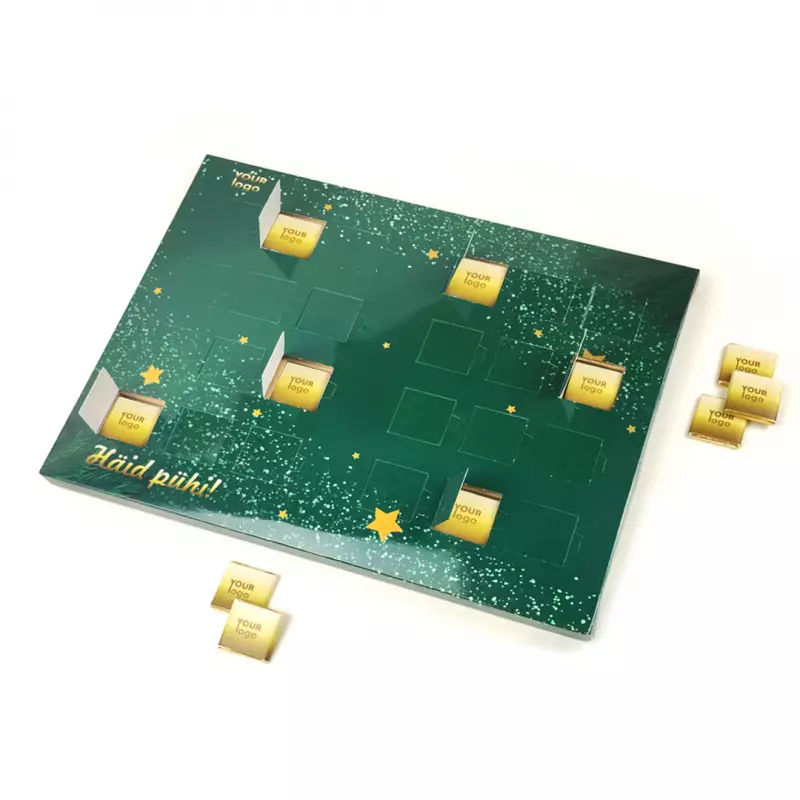 Kalenteri sisältää 24 palaa herkullista suklaata. Voit valita joko perinteisen maitosuklaan tai tumman suklaan. Suklaapalat on pakattu käärepaperiin, joka voidaan myös merkata logolla tai halutulla mainoslauseella. Käärepaperin alla olevan folion värivaihtoehtoja on kaksi: hopea tai kulta.