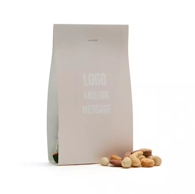 Tarjoa maukkaita pähkinöitä pakkauksesta, jossa on oma logo ja iskevä mainoslause.