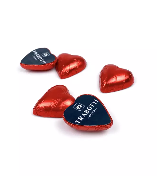 Sydämenmuotoinen mainossuklaa sopii täydellisesti ravintoloiden, hotellien ja yritysten vastaanottotiskille jakotuotteeksi.