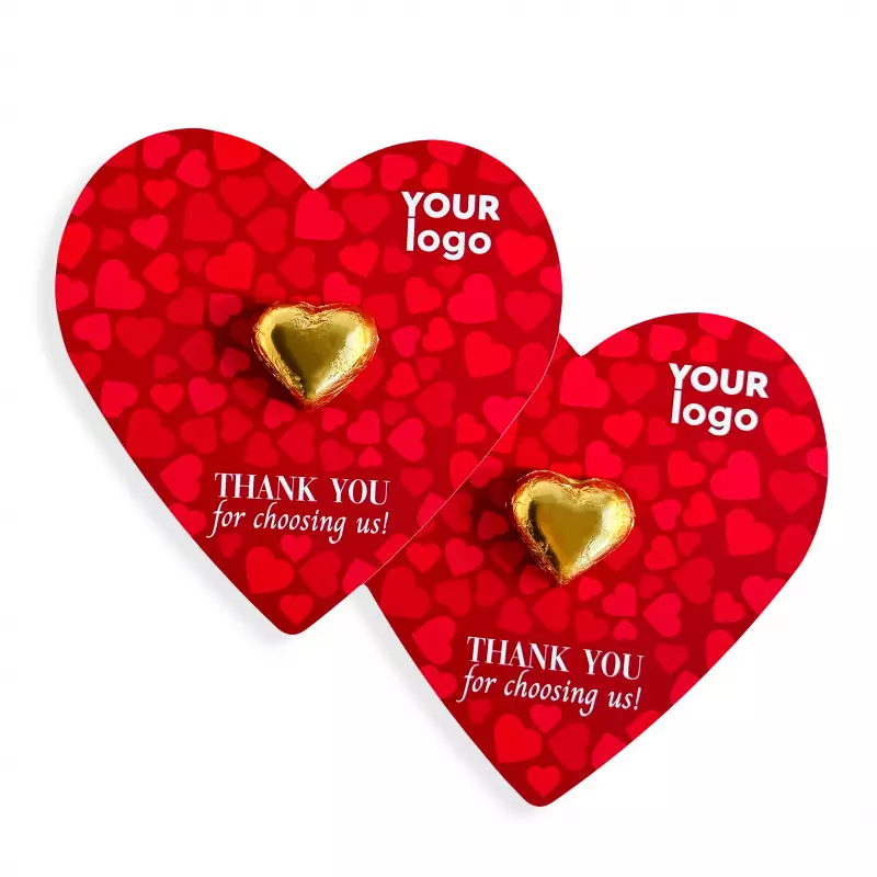 Herkullinen sydämenmuotoinen suklaapala kiinnitettynä sydämenmuotoiseen korttiin. Tuote sopii hyvin jaettavaksi messuilla tai esimekiksi kiitoskortiksi tilauksen yhteyteen.
